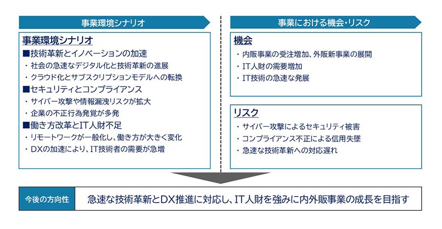 VUCAの時代と言われる現在、当社を取り巻く社会環境は急激に変化を続けています。DX(デジタルトランスフォーメーション)の推進、クラウドの普及、生成AIの登場など、IT分野における革新は日々加速しており、これらの変化にスピード感を持って対応することが求められています。