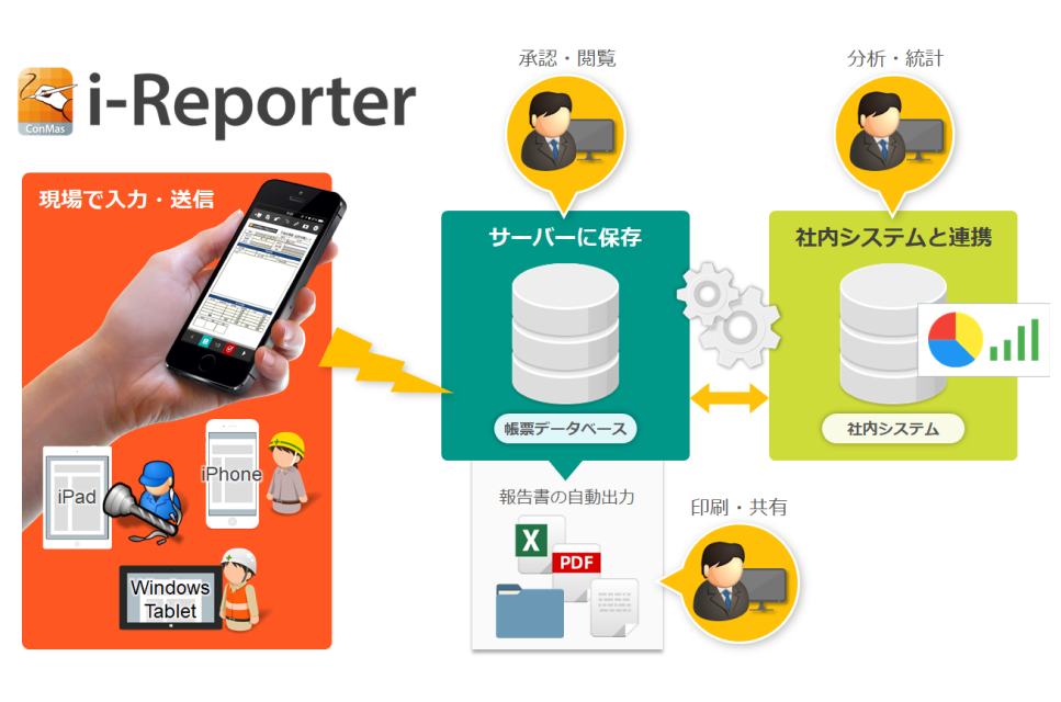 | ④ i-Reporter アプリ | iPad、iPhone、Windowsタブレット上で動作する、帳票入力のためのアプリです。 ConMas Designer で作成された<帳票定義>をダウンロードして帳票を作成したり、編集途中の帳票をダウンロードして続きを入力することができます。 |