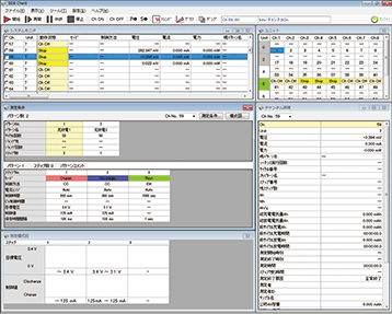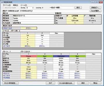 測定ステップやパターンを作成し、各種切替条件(ステップ終了条件、パターン終了条件、モジュール電池の測定終了条件、測定終了件)を設定します。作成した測定条件を他のチャンネルに一括コピーすることができます。