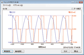 X軸に時間または電気量、Y軸に電圧・電流・電力の他、オプションのアナログ項目(温度・セル電圧)を表示できます。