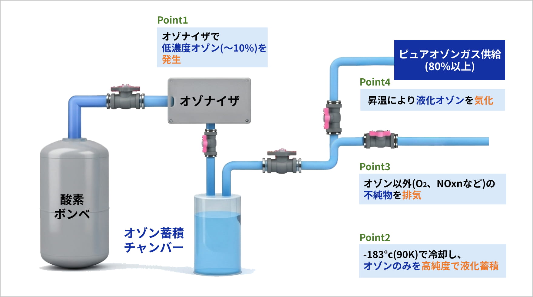 ピュアオゾン発生技術は、オゾナイザーで発生させたオゾンガスを冷却・液化することで高純度・高濃度オゾンを生成する技術です。