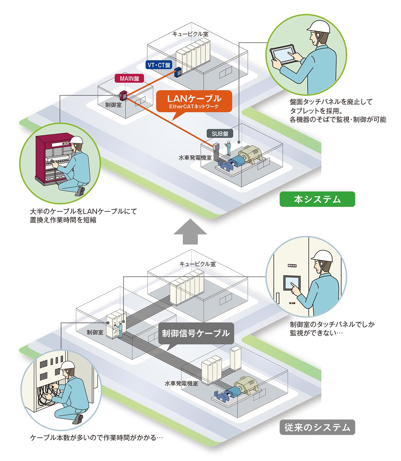 産業用LANによる超高速フィールドネットワークを構築した水力発電用の制御・保護システムです。