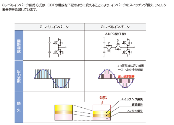 PWM変換回路を3レベル方式にすることで、400V系トランスレスタイプの業界最高水準の総合効率97%を実現しました。