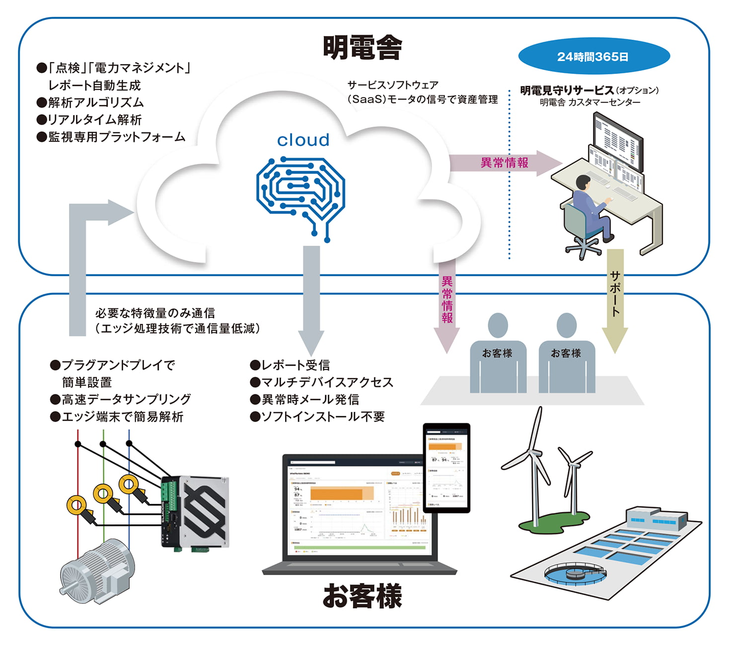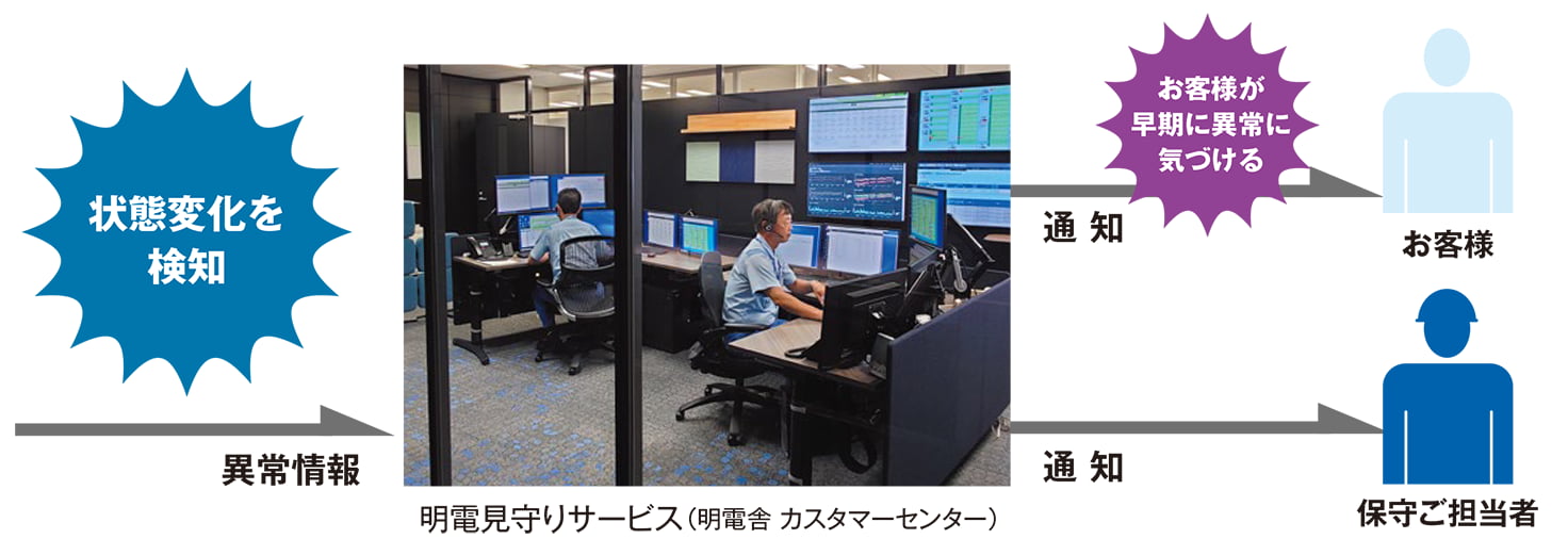 明電舎のカスタマーセンターが24時間365日対応し、有事の際に事前取り決めのサポートを実施。設備異常に常時対応し、明電舎製品以外の回転機や機械設備(ファン、ポンプ等)もサポートします。