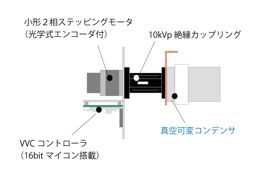 ・光学式エンコーダを採用し、ステッピングモータ動作を常時監視。不慮のモータ脱調を検出し自動的に回復できます。モータと真空可変コンデンサは高絶縁(絶縁耐圧10kVp)の専用カップリングを用いて接続されています。