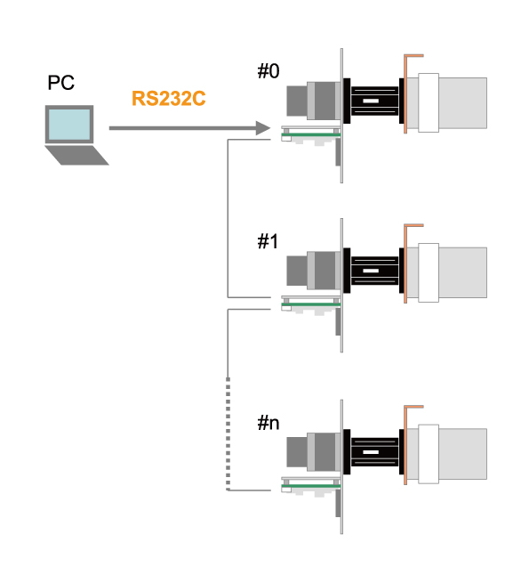 ・RS485 でカスケード接続可能。複数のモータ付真空可変コンデンサを上位系コントローラから一本のシリアルラインで制御可能です。