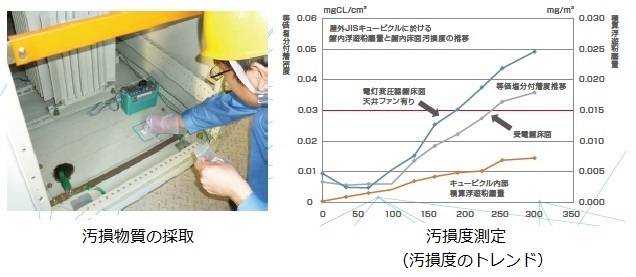 - 電気室、機器表面に堆積した汚損物を採取し汚損度を定量的に評価